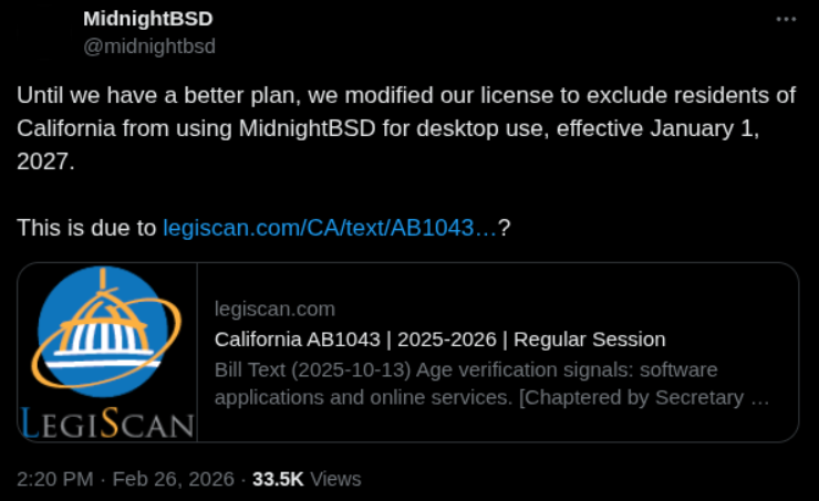 Responding the new California Law, AB1043, which threatens developers of Open Source operating systems with fines if they do not implement an age verification mechanism, MidnightBSD has modified their license to exclude use by Californians staring Jan 1, 2027.